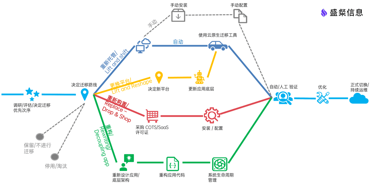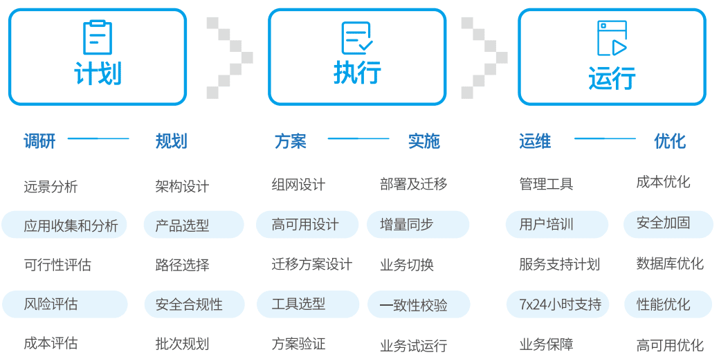 从上云迁移方法论及实践经验上看,知行志成将上云过程总结为四阶段的迁移流程,包括现状调研、方案设计、迁移实施和运维优化四个阶段。四个阶段相互关联,不可分离,每个阶段都是保障最终业务上云迁移的关键。